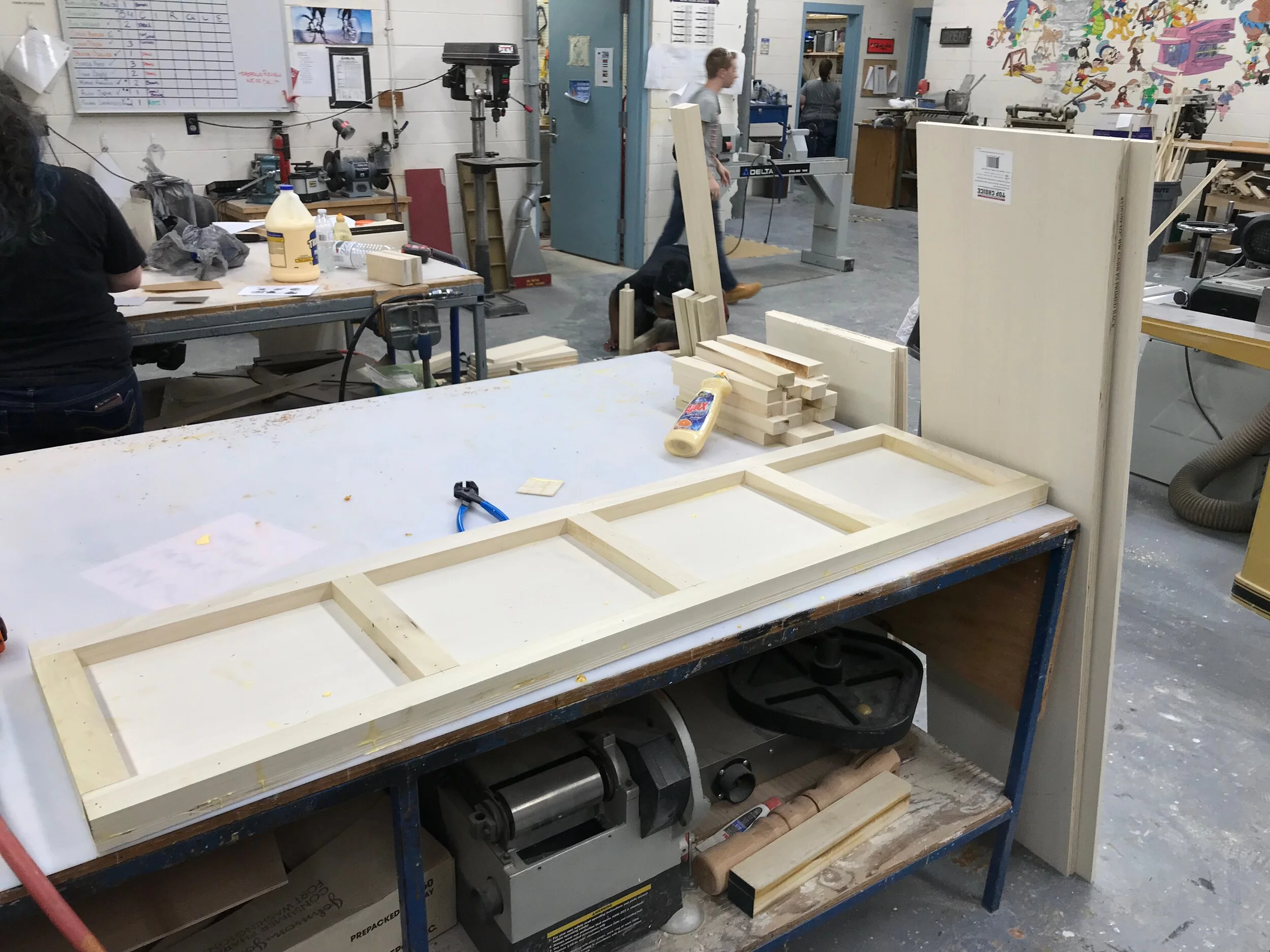 These pieces of traditional detailed, but 21st century fabricated, benches are a production of theatrical engineering. To keep the benches light the tops were built as hallow-core plywood units. To create the detail on the stretcher a pattern was created and cut out of 1/8” luan using a 50w CO2 laser cutter. The edge bevel on the bench top was hand planed to create a “hand build” traditional look.