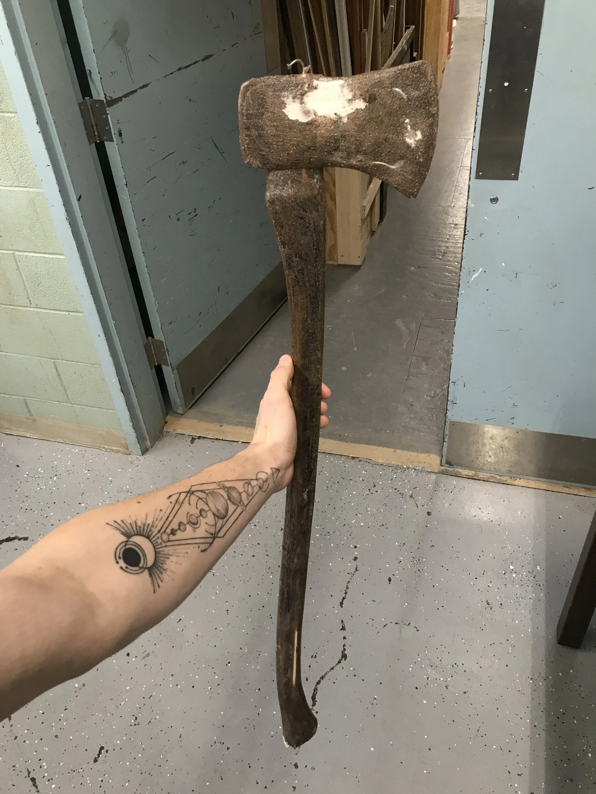 Modeled after a late 1890s Van Camp Axe this actor safe foam recreation was custom fabricated for the production. After doing a temporary modification to the head of a real Van Camp axe to bring it back to its full “unused” length than axe was molded in silicon. Then it was casted in FLEX FOAM-IT with a wooden dowel support spine and wire support in the head. Finally it was faux-finished to with a buffed graphite head and a dark wood grain handle then sealed with Crystal Gel.