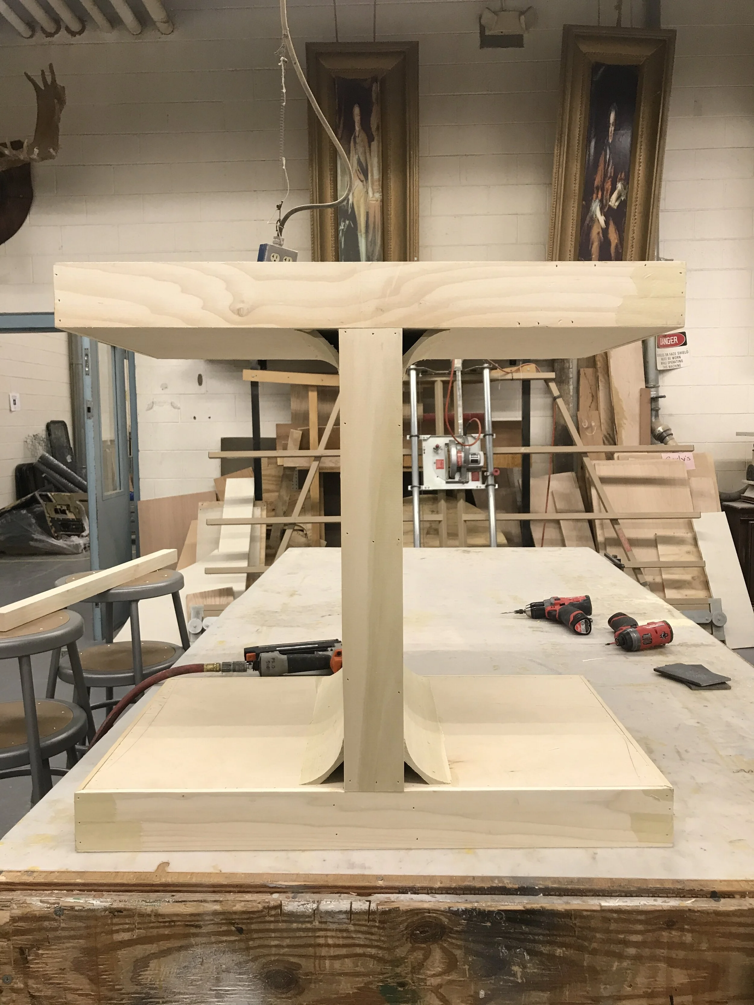 Built to both mimic the look and design of a steel I-Beam. Along with, being able to withstand being stood on in any direction, be beaten on by shovels, violently flipped over, and to be carried or slid by actors onstage. Fabricated out of 1/2” birch plywood in a hollow core, stress skin design with the center structure slotting into the top and bottom units for maximum structural advantage. Finished with a base coat of aluminium oil paint and a sealer of polycrylic for strength and elasticity.