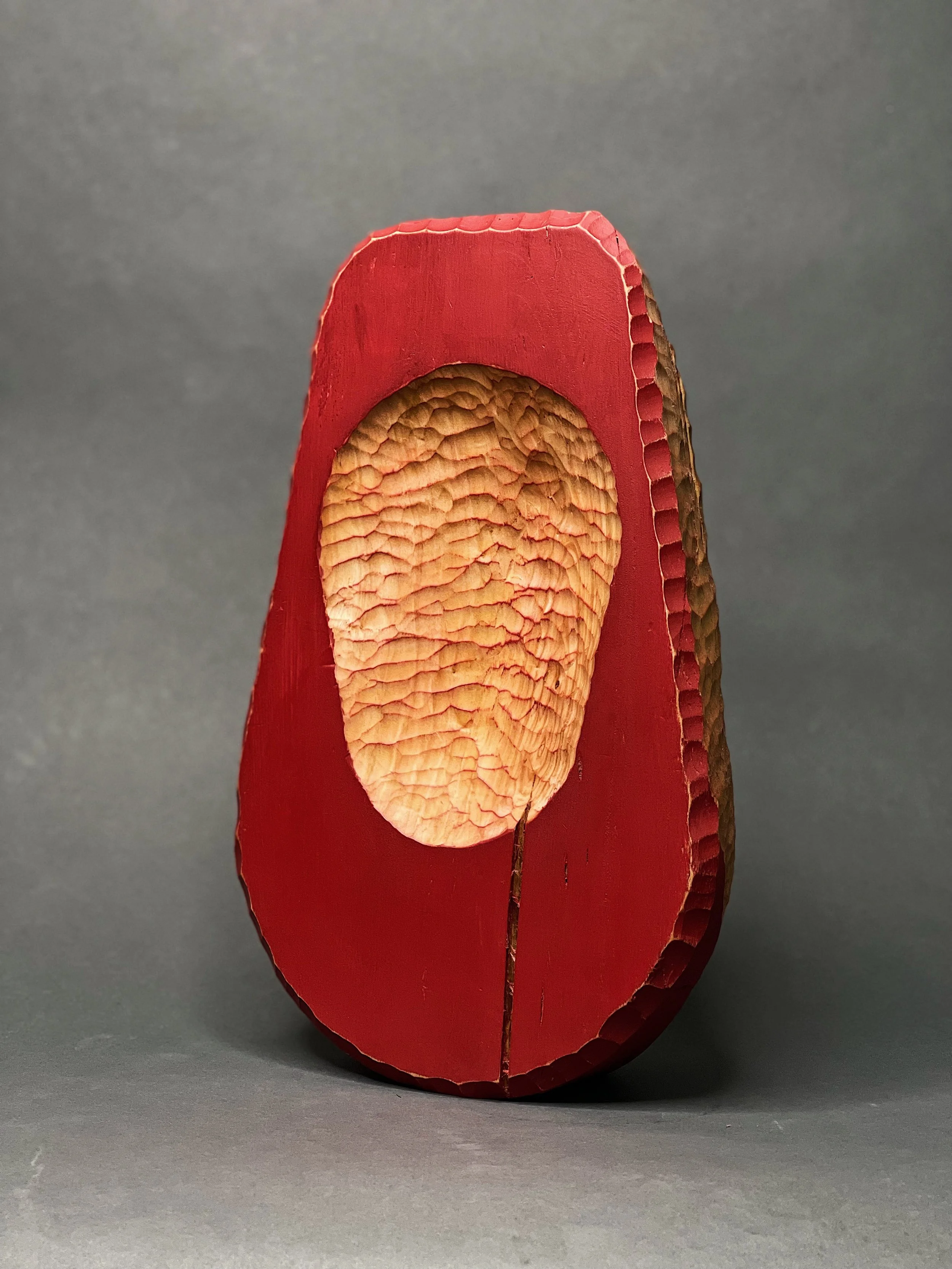 Early last fall, I came upon a completely warped block of pine sitting dusty in the corner of my studio. With no plan in mind, I began to bandsaw and carve upon it until I had reached what I deemed to be an end. Upon first stepping back from my piece, I realized I had created a half of an avocado, albeit a bit abstracted.