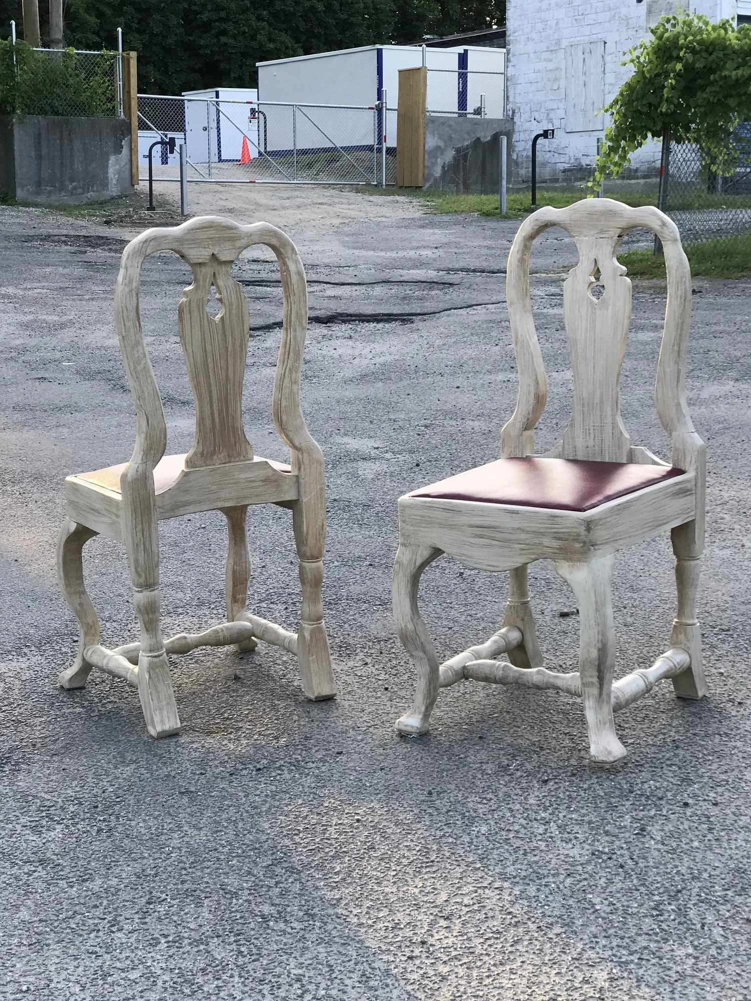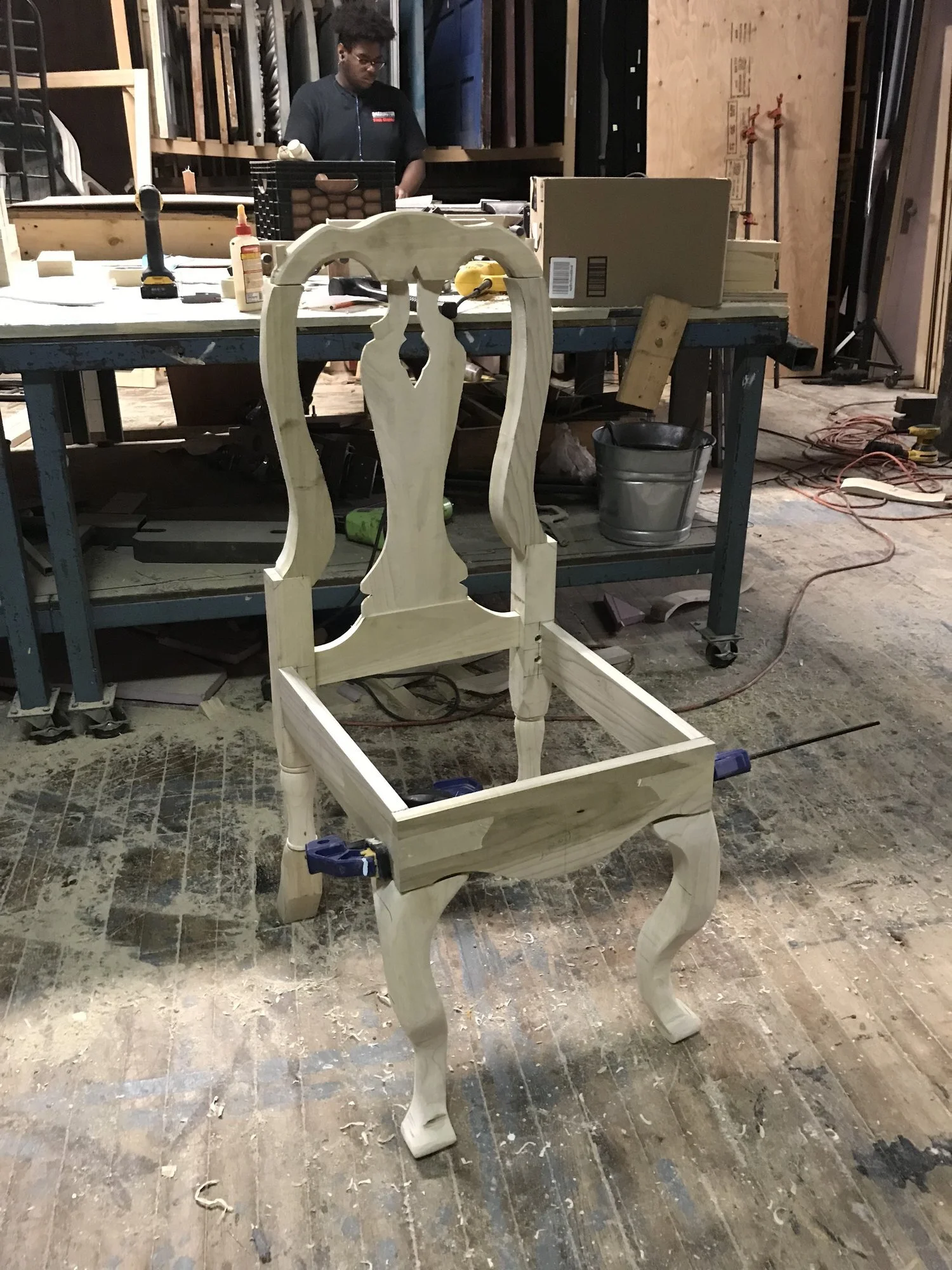 This set of 18th Century Swedish Rococo Chairs were custom re-designed and fabricated for theatrical use. These custom build chairs were designed and built to withstand being thrown across stage and flipped over multiple times per production. The process of fabricating these chairs ranged from turning to power carving to bandsawn cabriole legs to hand spokeshaved finishing. Originally a set of 4 chairs were to be built in a span of 2 weeks for the production. A change in the overall look of the chairs during this build resulted in only 3 chairs being completed. Thus, these chairs never made it on stage for the production.